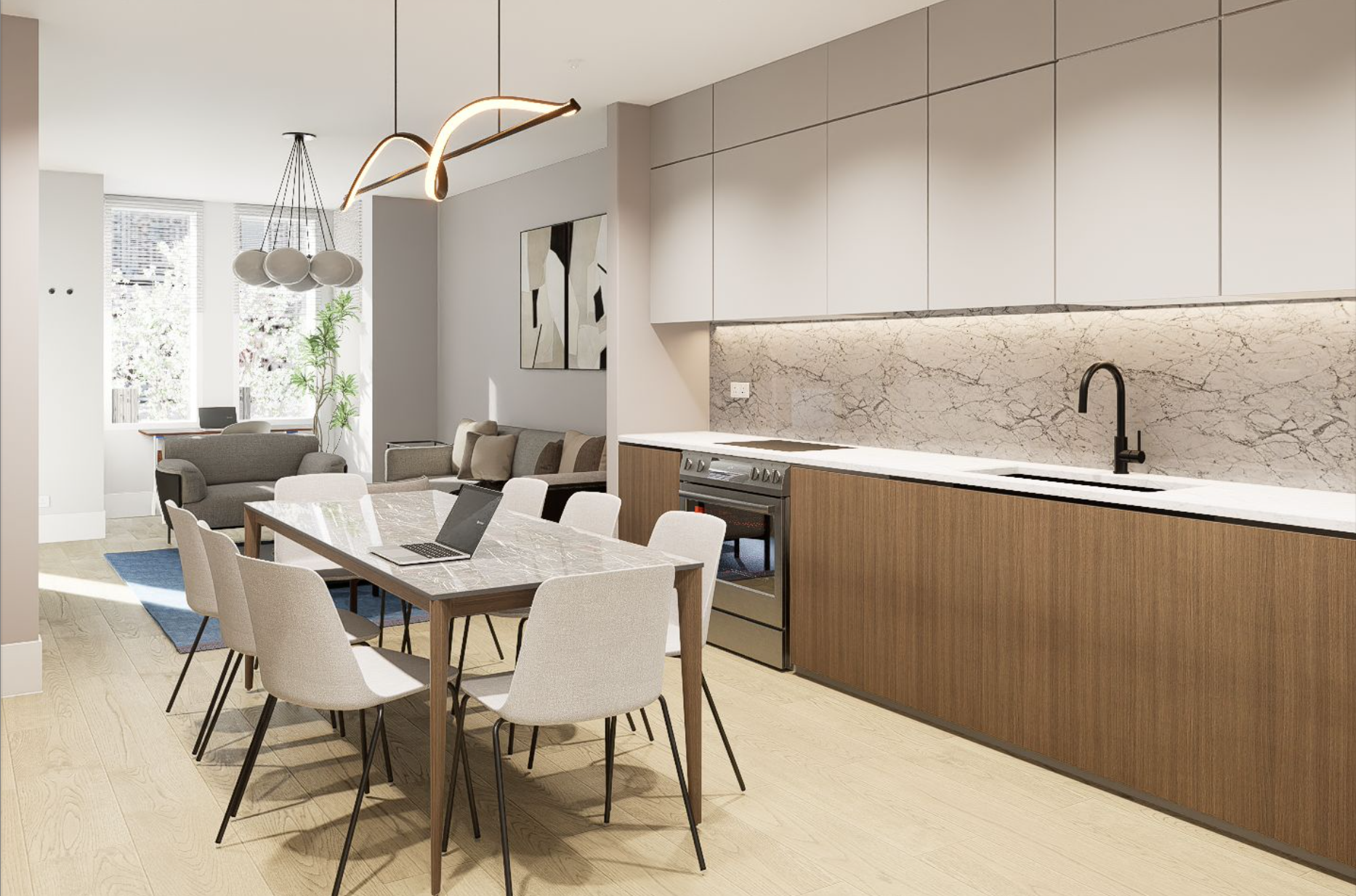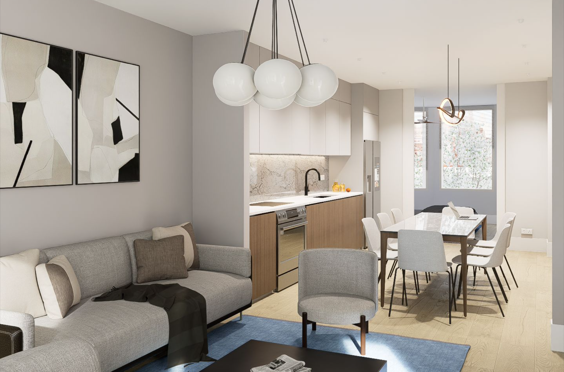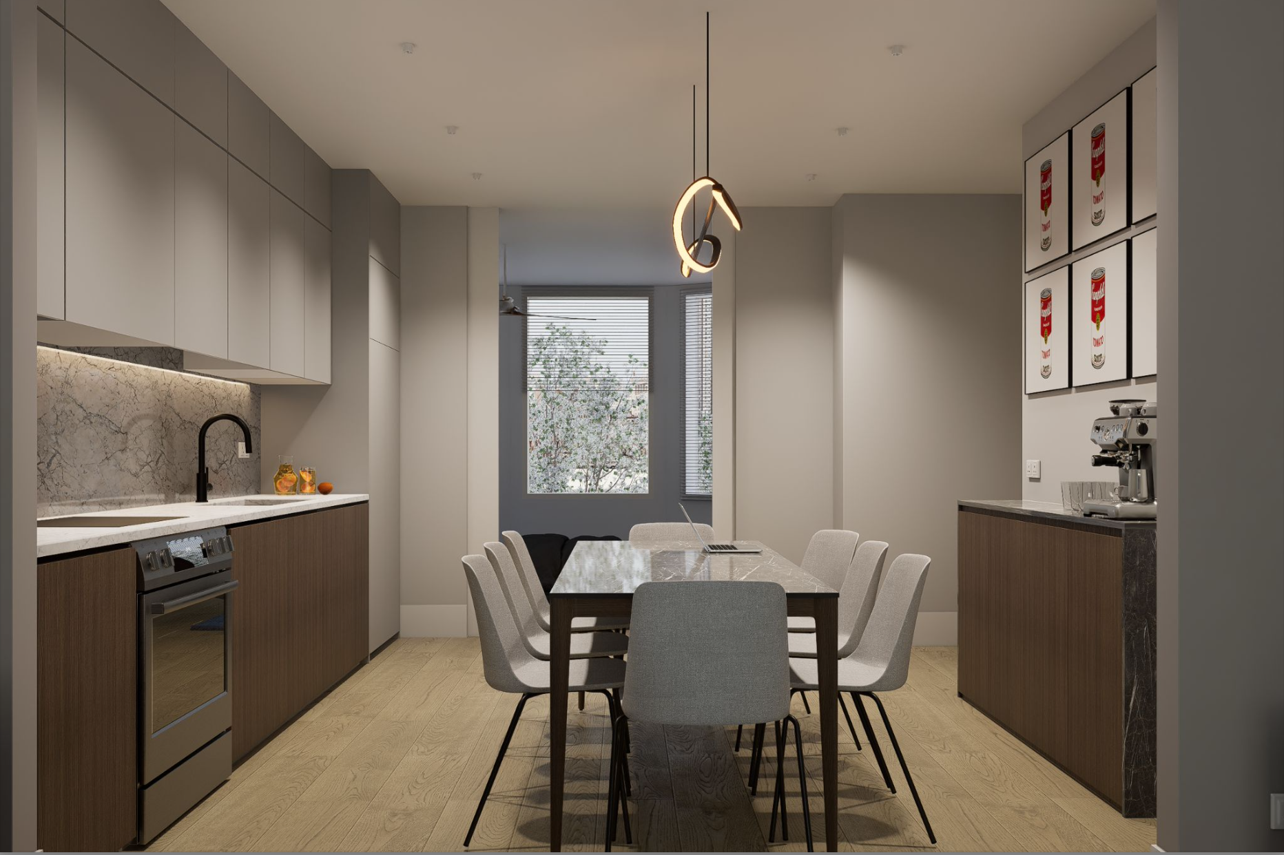 The units will be self-contained and finishes will be upper level quality. Each unit will contain an individual HVAC unit, tankless water heater and stacked washer and dryer unit. Flooring will consist of hardwood finished in place with alternate flooring consisting of European tile installed in the bathrooms. Kitchens and bathrooms will consist of upper level cabinetry and vanities (baths). Kitchen appliances will consist of upper mid-level stainless steel appliances (dishwasher, refrigerator, range/oven, and microhood as well as upper level kitchen and bath fixtures. Countertops will be solid-surface (granite, quartz or equivalent). Wall tile and backsplashes for each unit will be high-end stone or equivalent. Kitchen and bathrooms will consist of European tiles. The building will be equipped with a full sprinkler system and smoke detectors. The units will also be equipped with an alarm and intercom system and will be separately metered for electricity. The exterior walls of the building are brick, the roof surface is will be a composite material, and gutters and downspouts will be metal or vinyl. The units will contain insulated front glass entry doors. Windows will be a combination of vinyl double-hung, casement and fixed, insulated glass with screens.